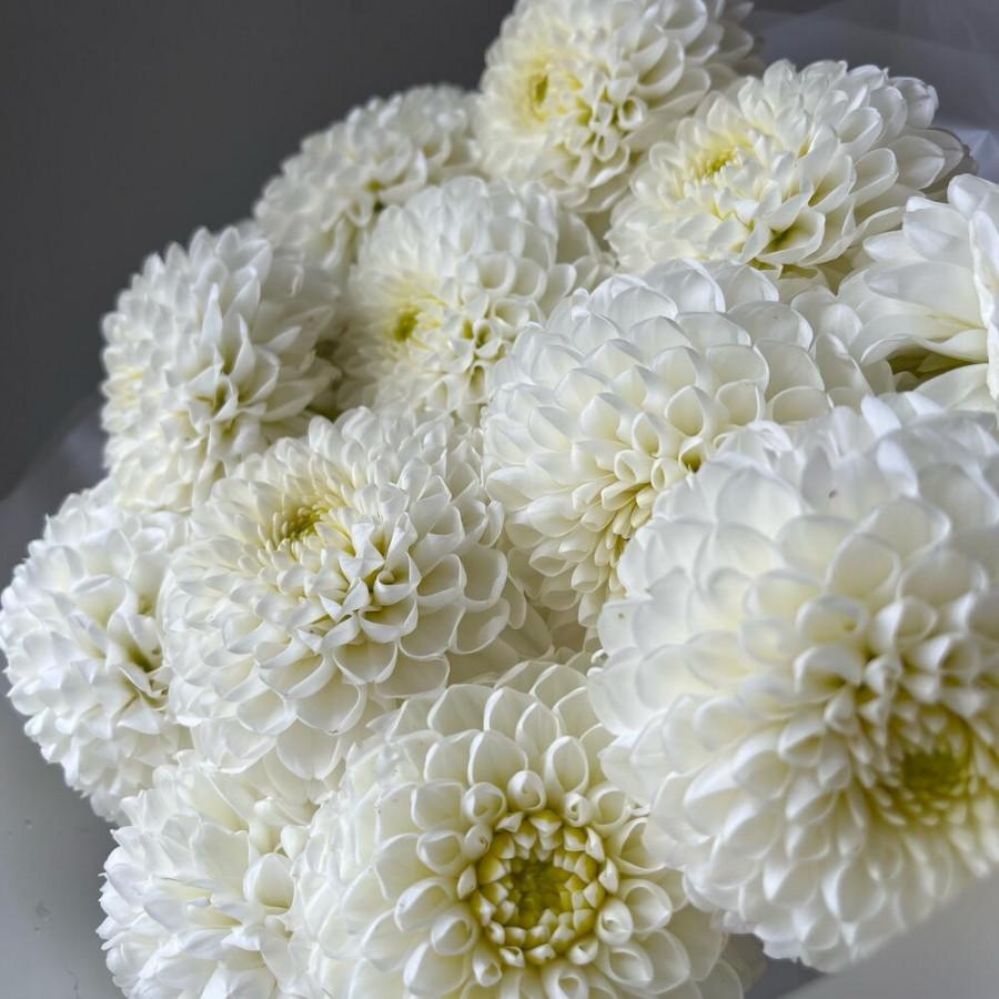 На фото букет из 13 белых георгин. В составе: георгина 13 шт, дизайнерская упаковка 1 шт, атласная лента 1 шт, . Все цветы свежие и ароматные, букет красиво оформлен и отлично подходит для подарка. Доступна доставка цветов или самовывоз.