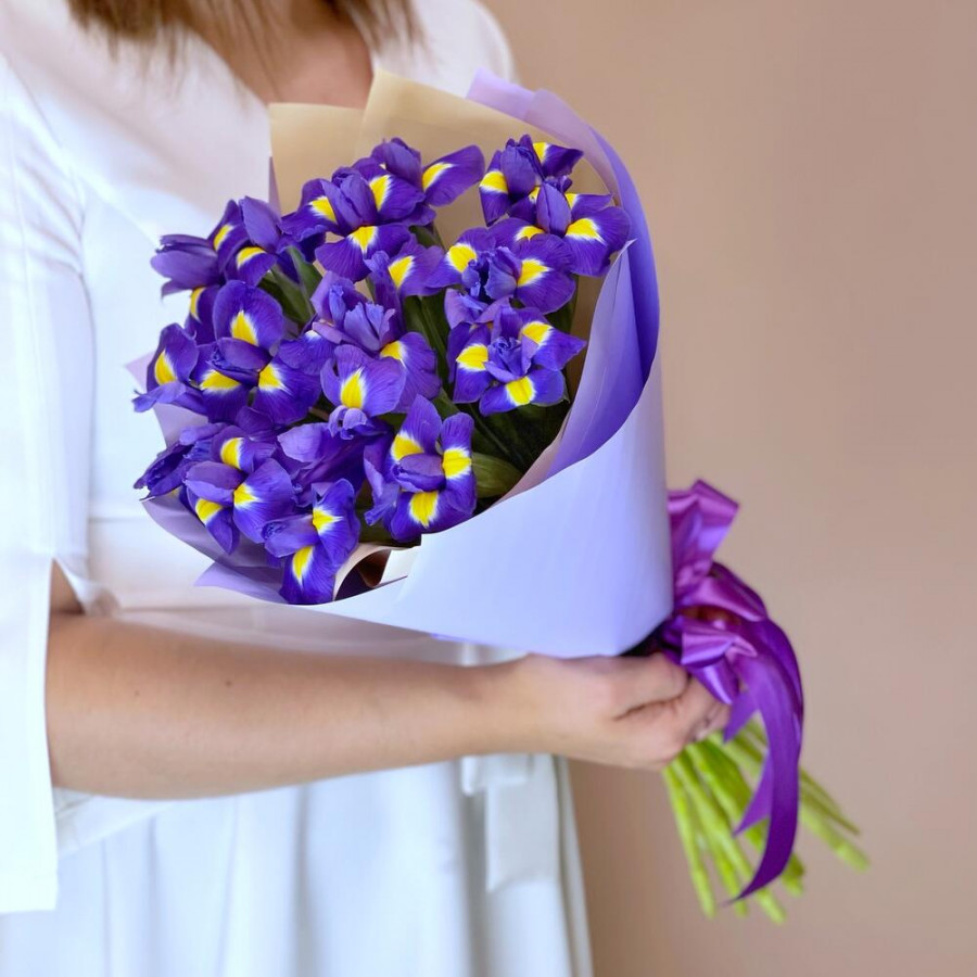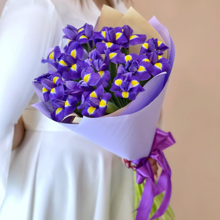На фото букет из 19 фиолетовых ирисов. В составе: ирис 19 шт, дизайнерская упаковка 1 шт, атласная лента 1 шт, . Все цветы свежие и ароматные, букет красиво оформлен и отлично подходит для подарка. Доступна доставка цветов или самовывоз.