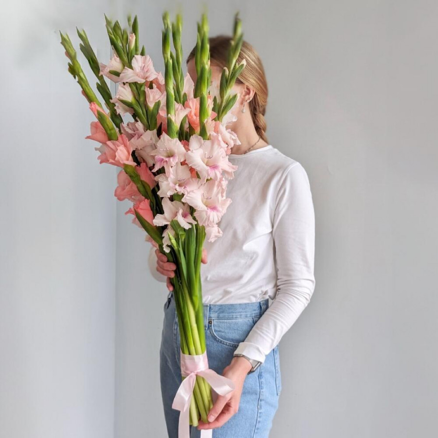 На фото букет из 19 розовых гладиолусов. В составе: гладиолус 19 шт, атласная лента 1 шт, . Все цветы свежие и ароматные, букет красиво оформлен и отлично подходит для подарка. Доступна доставка цветов или самовывоз.