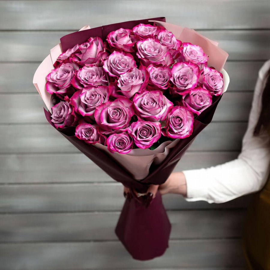 На фото букет из 23 фиолетовых роз. В составе: роза 23 шт, дизайнерская упаковка 1 шт, атласная лента 1 шт, . Все цветы свежие и ароматные, букет красиво оформлен и отлично подходит для подарка. Доступна доставка цветов или самовывоз.