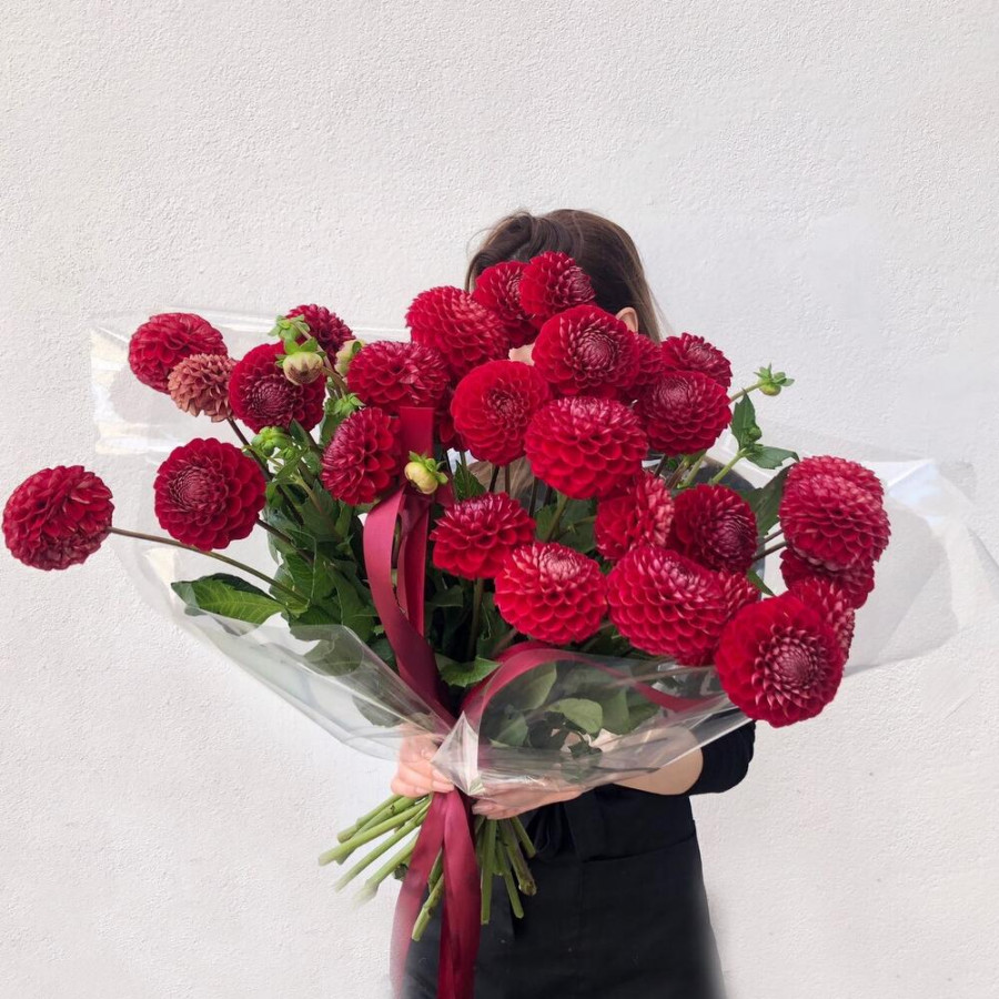 На фото букет из 29 красных георгин. В составе: георгина 29 шт, дизайнерская упаковка 2 шт, атласная лента 1 шт, . Все цветы свежие и ароматные, букет красиво оформлен и отлично подходит для подарка. Доступна доставка цветов или самовывоз.