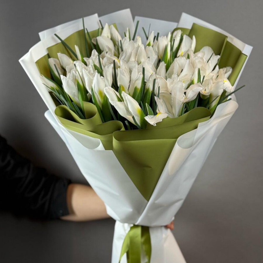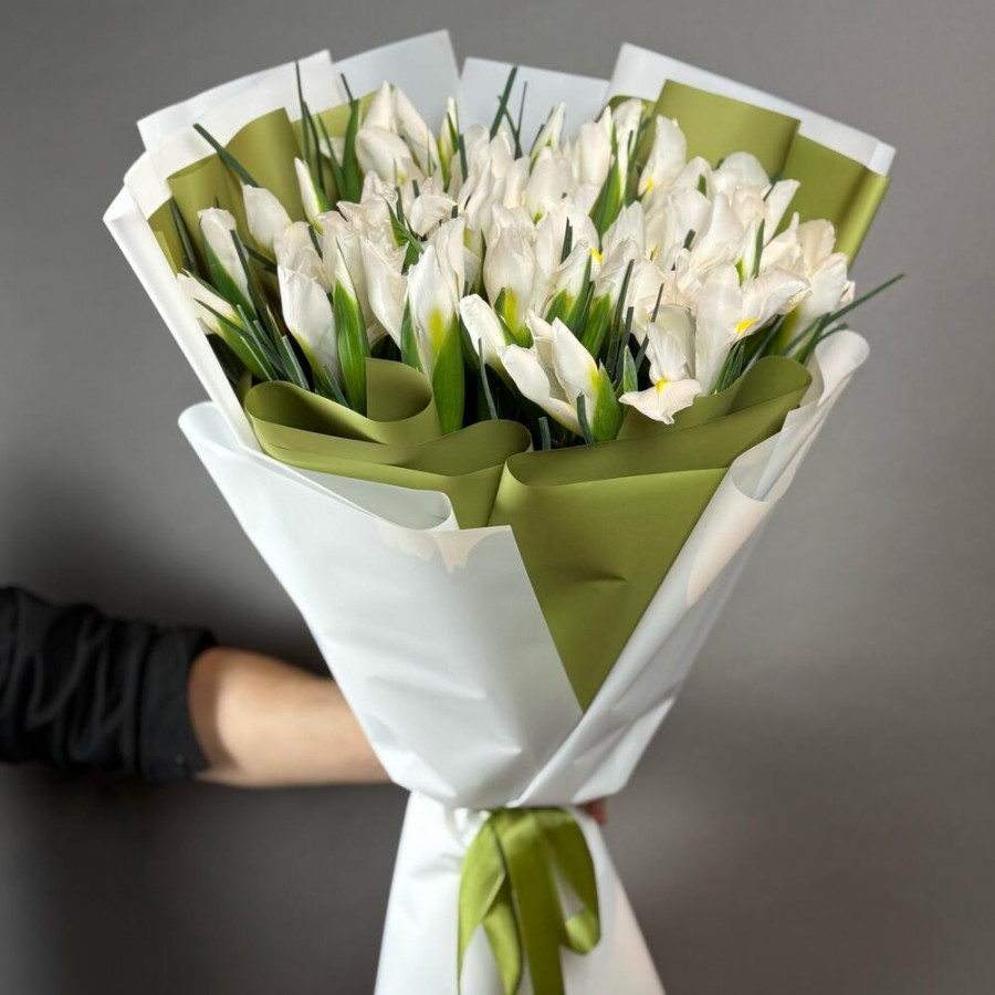 Лента атласная - 1 шт. Пленка дизайнерская - 1 шт. открыточка - 1 шт. ирисы белые - 39 шт.