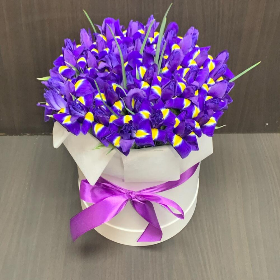 51 фиолетовый ирис в шляпной коробке в Волгограде