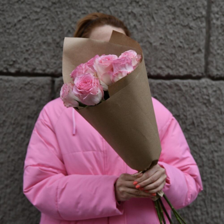На фото букет из 7 розовых роз. В составе: роза 7 шт, дизайнерская упаковка 1 шт, атласная лента 1 шт, . Все цветы свежие и ароматные, букет красиво оформлен и отлично подходит для подарка. Доступна доставка цветов или самовывоз.