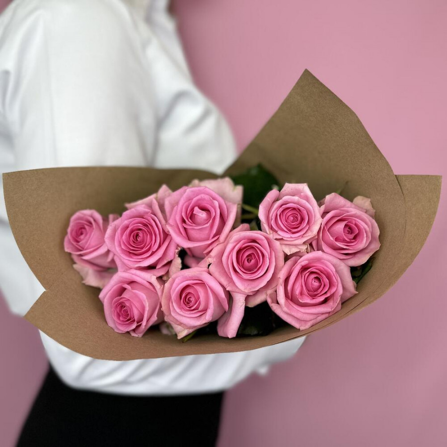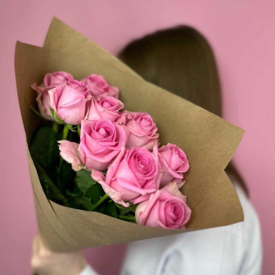 На фото букет из 9 розовых роз. В составе: роза 9 шт, крафт-бумага 1 шт, атласная лента 2 шт, . Все цветы свежие и ароматные, букет красиво оформлен и отлично подходит для подарка. Доступна доставка цветов или самовывоз.