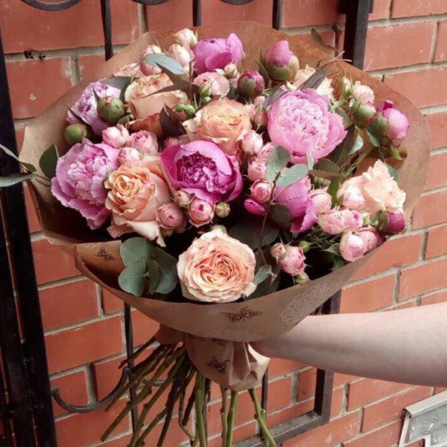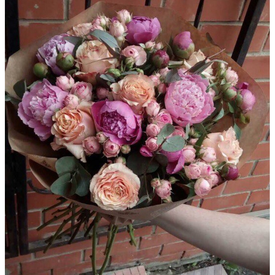 Нет девушки в мире, которую оставит равнодушной этот изысканный букет из пионов и роз, который пышной красотой своей может покорить даже самую изыскательную натуру! Нежное сочетание розовых и персиковых трепетных лепестков вскружат голову получательнице, и восхищению её не будет конца.