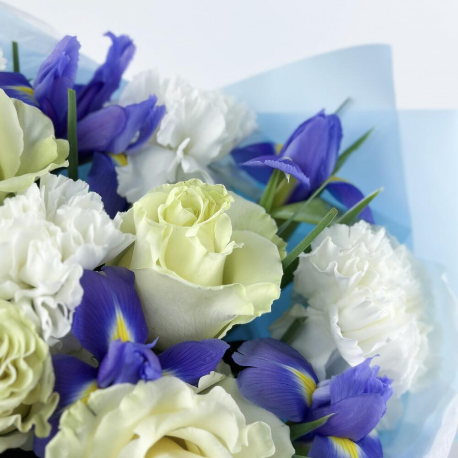 Букет из белых гвоздик, синих ирисов и белых роз фото 4