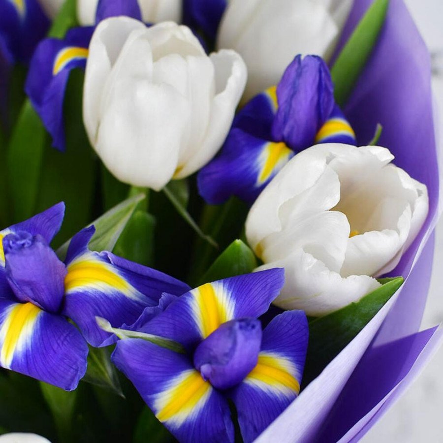 На фото букет из синих ирисов и белых тюльпанов. В составе: ирис 10 шт, тюльпан 13 шт, крафт-бумага 1 шт, атласная лента 1 шт, . Все цветы свежие и ароматные, букет красиво оформлен и отлично подходит для подарка. Доступна доставка цветов или самовывоз.