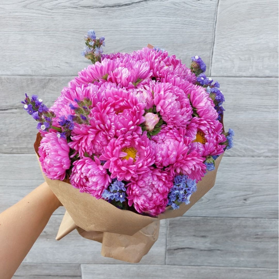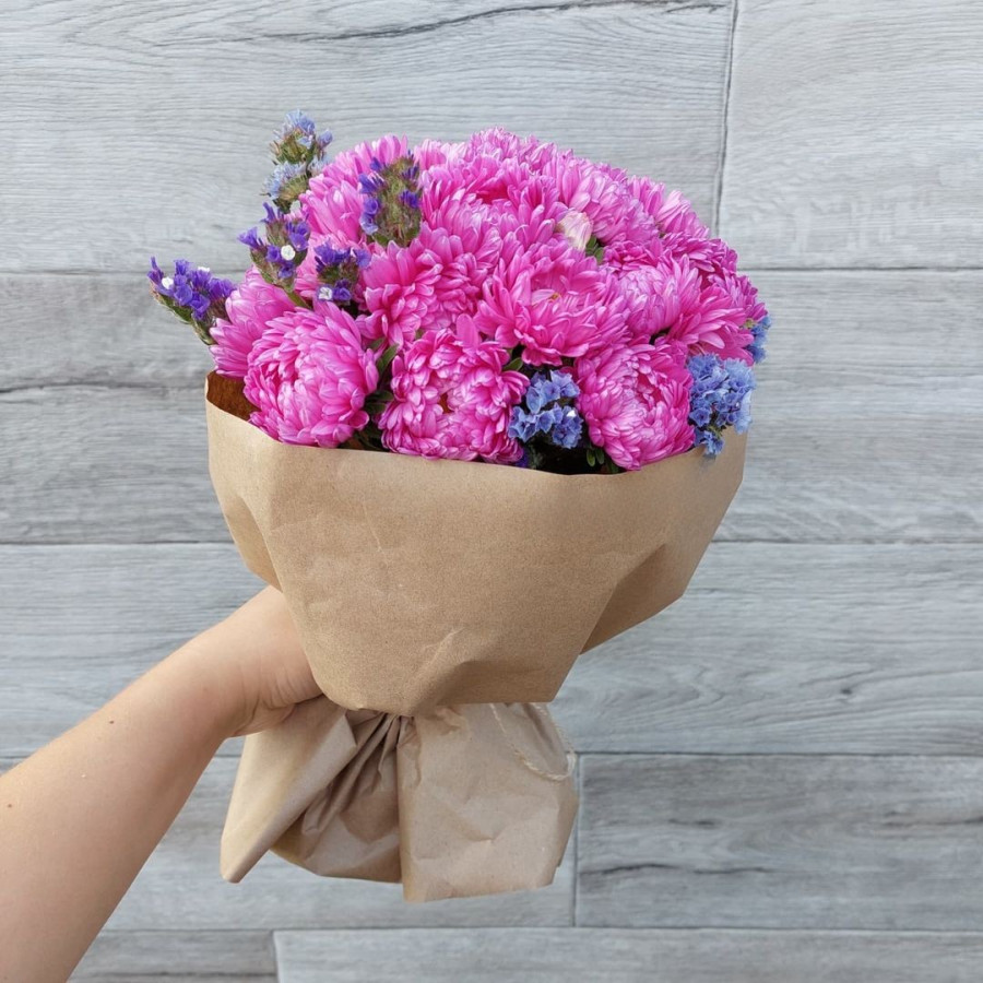 На фото букет из 15 розовых астр. В составе: астра 15 шт, дельфиниум 2 шт, статица 3 шт, крафт-бумага 1 шт, атласная лента 1 шт, . Все цветы свежие и ароматные, букет красиво оформлен и отлично подходит для подарка. Доступна доставка цветов или самовывоз.
