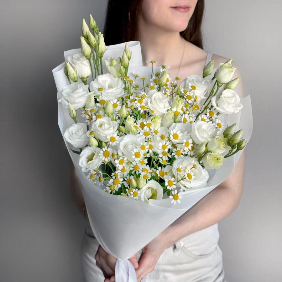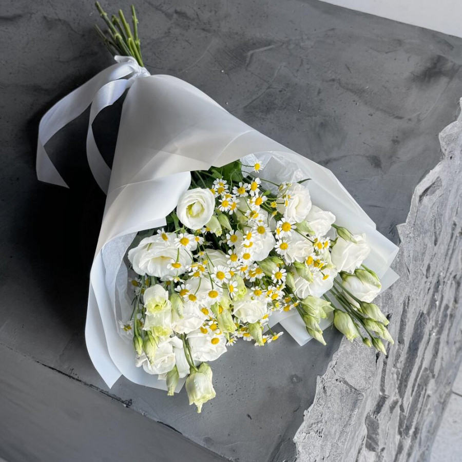 На фото букет из белых эустом и ромашки. В составе: эустома (лизиантус) 5 шт, танацетум 4 шт, дизайнерская упаковка 1 шт, атласная лента 1 шт, . Все цветы свежие и ароматные, букет красиво оформлен и отлично подходит для подарка. Доступна доставка цветов или самовывоз.