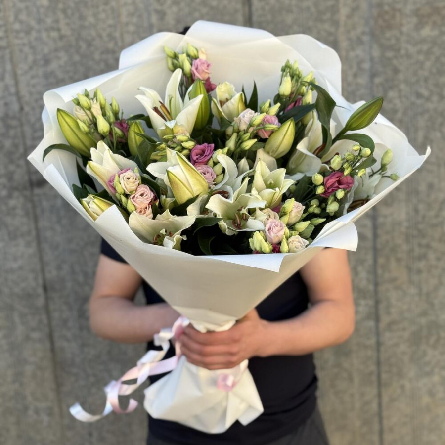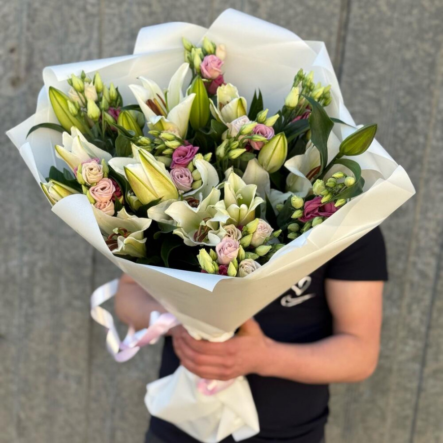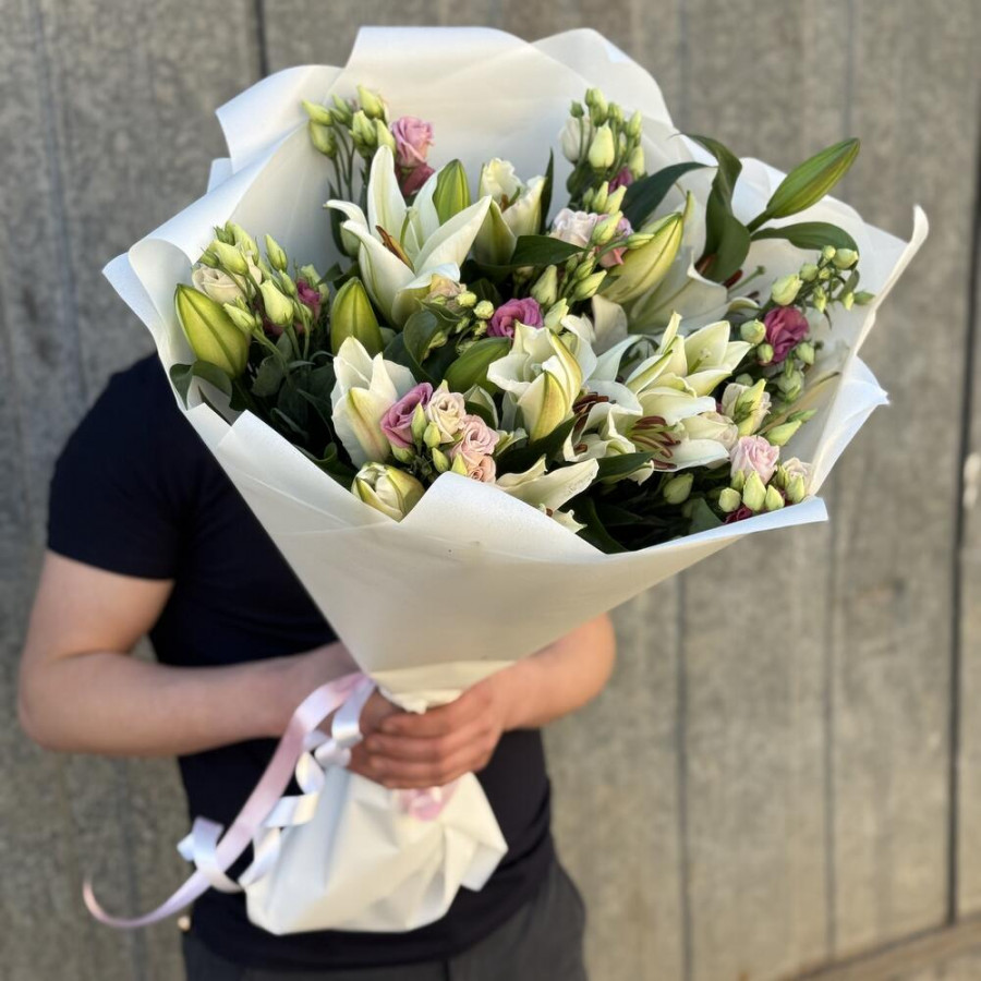 На фото букет из белых лилий и розовых эустом. В составе: эвкалипт 10 шт, лилия 10 шт, дизайнерская упаковка 2 шт, атласная лента 1 шт, . Все цветы свежие и ароматные, букет красиво оформлен и отлично подходит для подарка. Доступна доставка цветов или самовывоз.